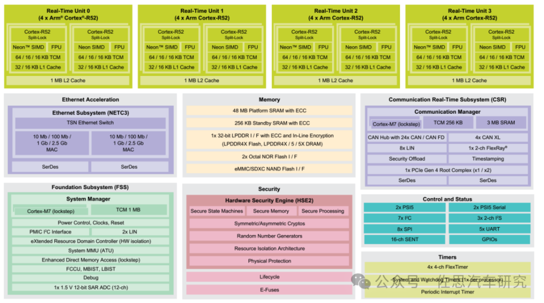 S32N55内部包含4个实时运算单元,每单元一个4核心的Cortex-R52。