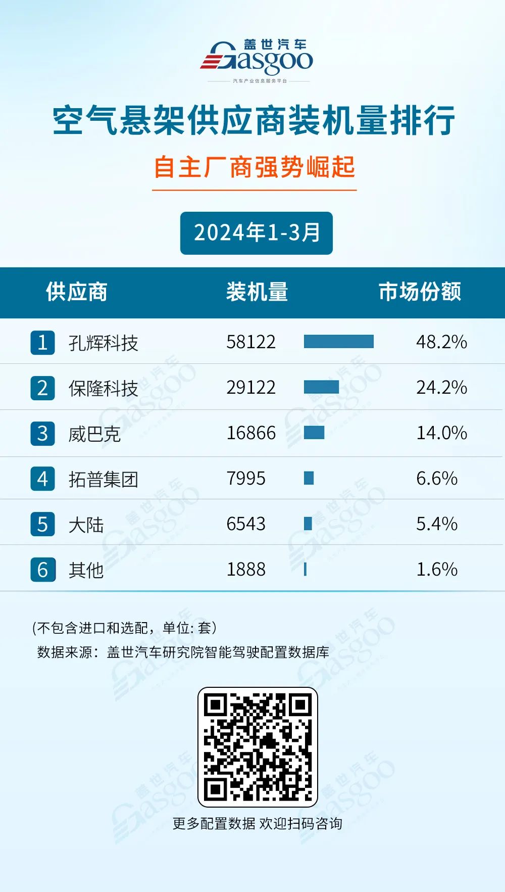 “空气悬架供应商装机量排行”中,孔辉科技以58,122套的装机量和48.2%的市场份额,稳坐榜首位置,展示了其在空气悬架领域的强大实力和技术领先优势。保隆科技紧随其后,以29,122套的装机量和24.2%的市场份额位居第二,同样表现出不俗的竞争力。威巴克、拓普集团和大陆分别位列第三、第四和第五,虽然装机量和市场份额相对较低,但这两家企业在空气悬架领域也拥有一定的技术积累和市场份额。而其他企业则有1,888套的装机量和1.6%的市场份额位。从排名可以看出,自主厂商在空气悬架领域的竞争已经越来越激烈,孔辉科技和保隆科技等企业的崛起也预示着未来市场竞争格局的变化。