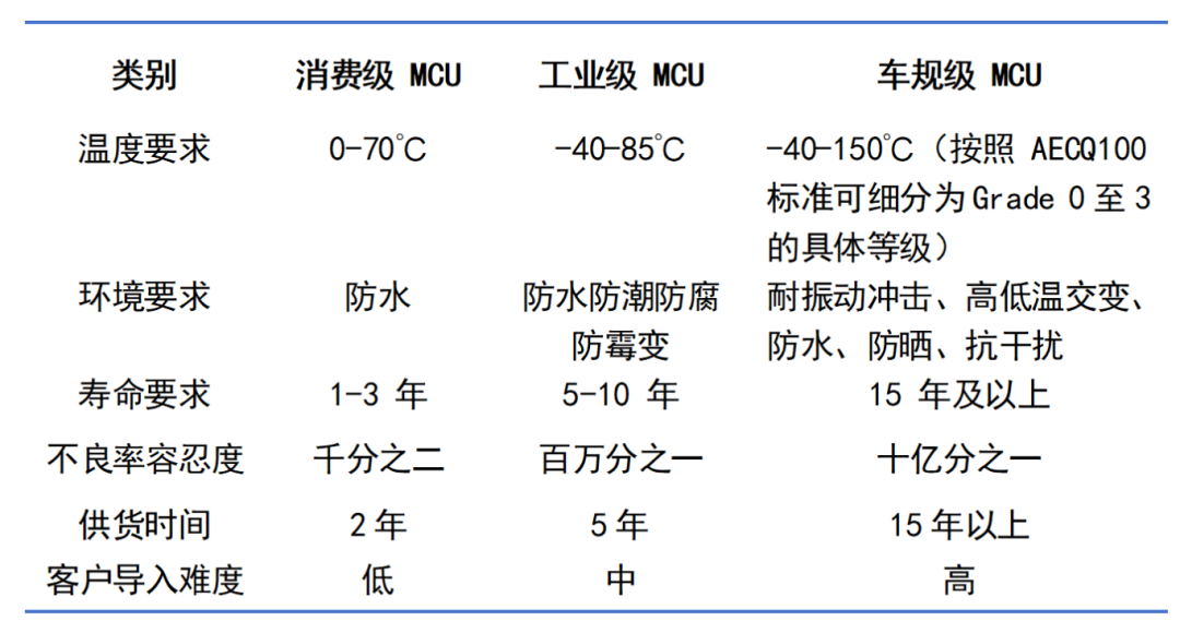 图:车规级 MCU 与消费级、工业级 MCU 在各项指标要求上的对比情况