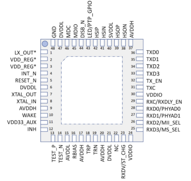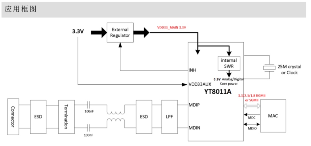 YT8011A管脚2023年,裕太微发布了车载千兆以太网芯片—YT8011A系列。该系列产品是一种高度集成的解决方案。YT8011A 是一款兼容车载以太网百兆100BASE-T1和千兆1000BASE-T1标准的以太网收发器,支持IEEE802.3bw和802.3bp协议。其通过一对差分的屏蔽或者非屏蔽电缆,传输和接收以太网数据包。该系列采用了高速DSP技术和模拟前端(AFE),同时具备极性检测与校正、自适应均衡、回声消除、定时恢复和纠错等功能。MAC(数据链路层)和PHY(物理层)之间的数据传输通过简化的千兆媒体独立接口(RGMII)或串行千兆媒体独立接口(SGMII)进行。可支持EEE节能以太网、1588时间同步协议、IEEE802.1AS时间同步协议。支持车载以太网的睡眠(SLEEP)/唤醒(WAKE)功能。SLEEP 功能使以太网物理层收发 器进入睡眠模式,获得更低的功耗。WAKE 功能可以有效地将以太网物理层收发器从睡眠模式唤醒到正常操作模式。YT8011A 采用最先进的混合信号技术和模拟前端(AFE),通过 UTP 电缆实现高速数据传输和接收。YT8011A 实现了自适应均衡、串扰消除、回波消除、数据恢复和纠错等功能, 以提供 100Mbps 或 1000Mbps 的强大传输和接收能力。它提供高静电放电(ESD)保护,以 及优异的电磁兼容性(EMC)性能。