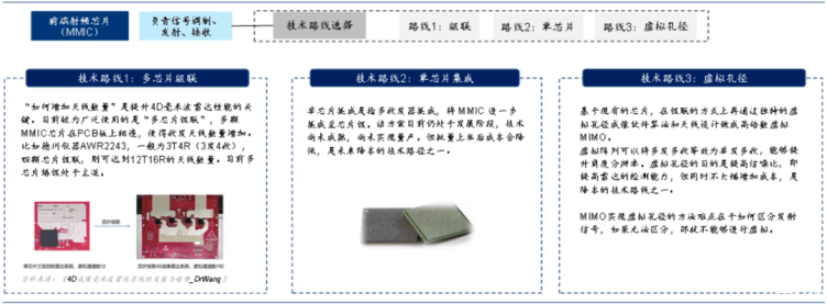 而就技术路线来看,4D毫米波雷达大致可分为多芯片级联、单芯片集成、虚拟孔径成像、超材料的“进化”路线。