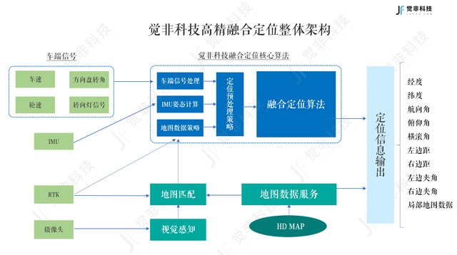 “数据融合”同时也是高精定位的灵魂。在技术层面上,觉非在原有以IMU+GNSS+RTK组合定位的基础上,融合了车身信号、视觉感知信息与高精度地图数据,可将位置、速度、时间、航向信息,以及车辆本身的方向盘转角、轮速、转向灯信号等,传递至数据处理终端进行实时数据融合计算,根据数据质量组合不同的定位判断策略,同时结合视觉设备提供的环境信息数据,辅助系统对于周围环境感知进行行为判断。