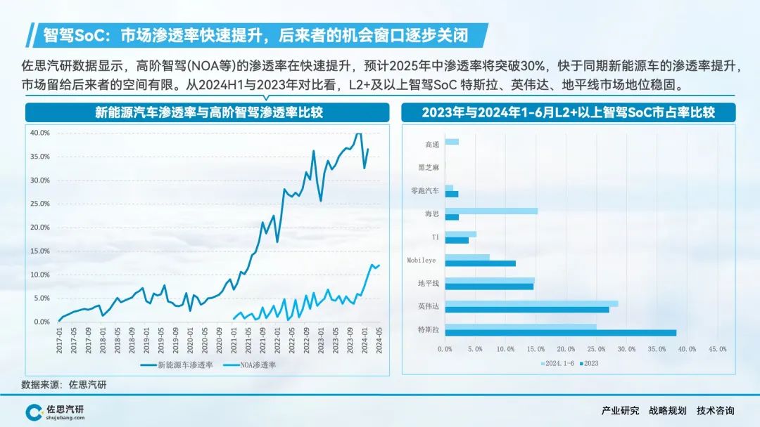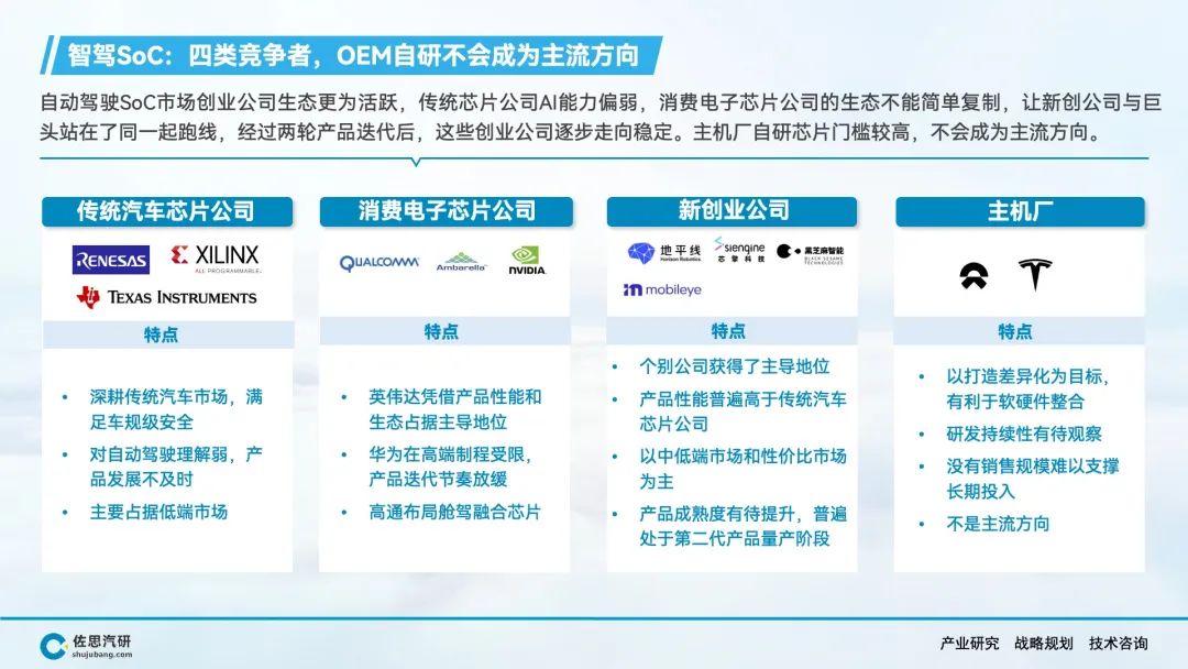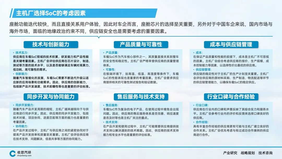 汽车智能化的市场渗透率在快速提升,成熟SoC供方的增加,意味着主机厂对新进入者的选择将更加挑剔;另一方面,舱驾融合趋势下,以前分离的座舱和智驾SoC市场格局仍有打破重组的可能性。