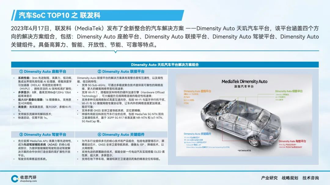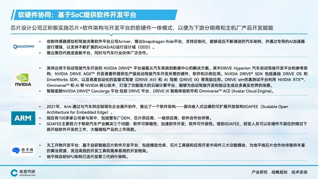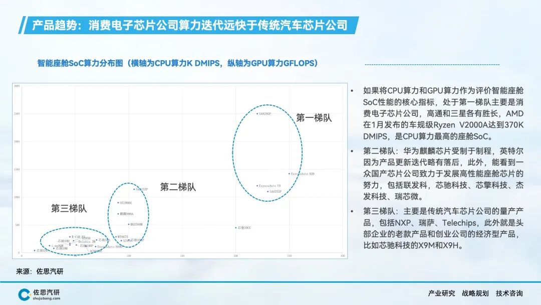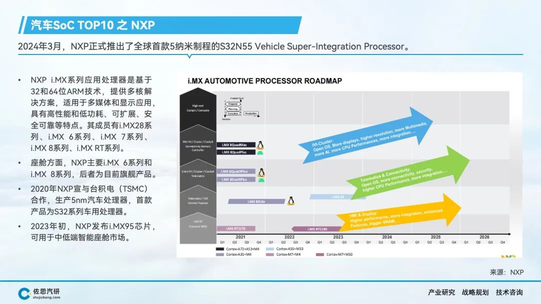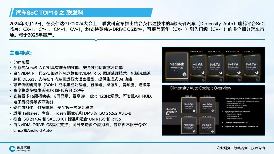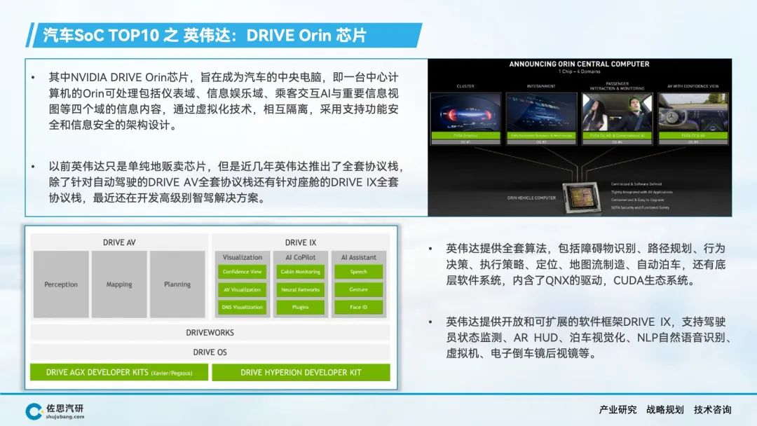 自动驾驶、智能座舱产生了海量的数据和丰富的应用场景,AI大模型上车对端侧算力的强劲需求,推动车载SoC市场的快速增长。在车载SoC市场结构转型的窗口期,传统汽车半导体公司在节奏上落后了,而消费电子类半导体公司敏锐的抓住了市场机会,英伟达、高通、华为等公司在车载SoC领域快速崛起,并抢占了大部分市场份额。