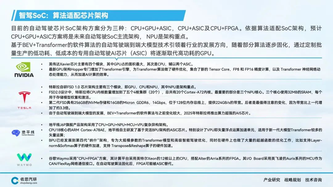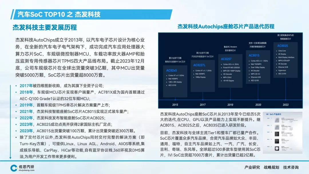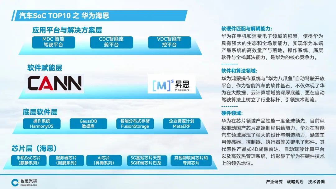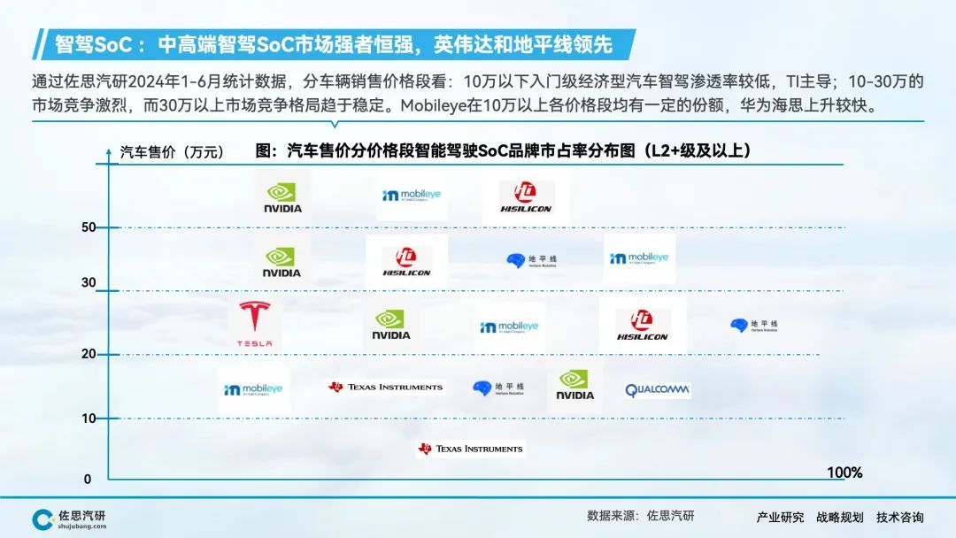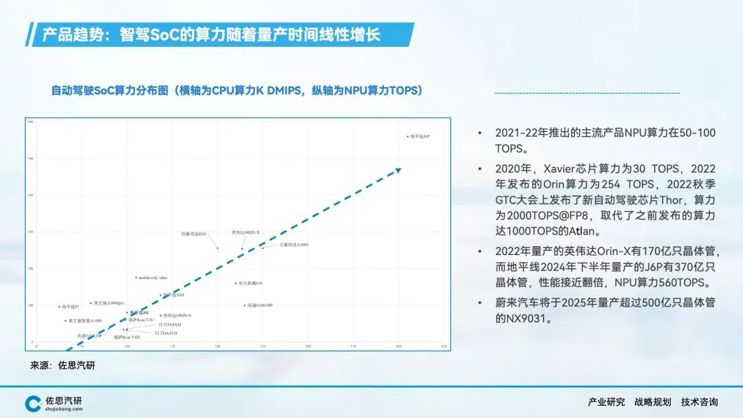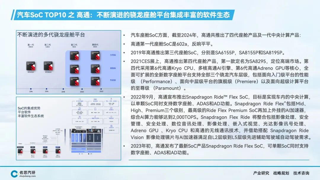 自动驾驶、智能座舱产生了海量的数据和丰富的应用场景,AI大模型上车对端侧算力的强劲需求,推动车载SoC市场的快速增长。在车载SoC市场结构转型的窗口期,传统汽车半导体公司在节奏上落后了,而消费电子类半导体公司敏锐的抓住了市场机会,英伟达、高通、华为等公司在车载SoC领域快速崛起,并抢占了大部分市场份额。