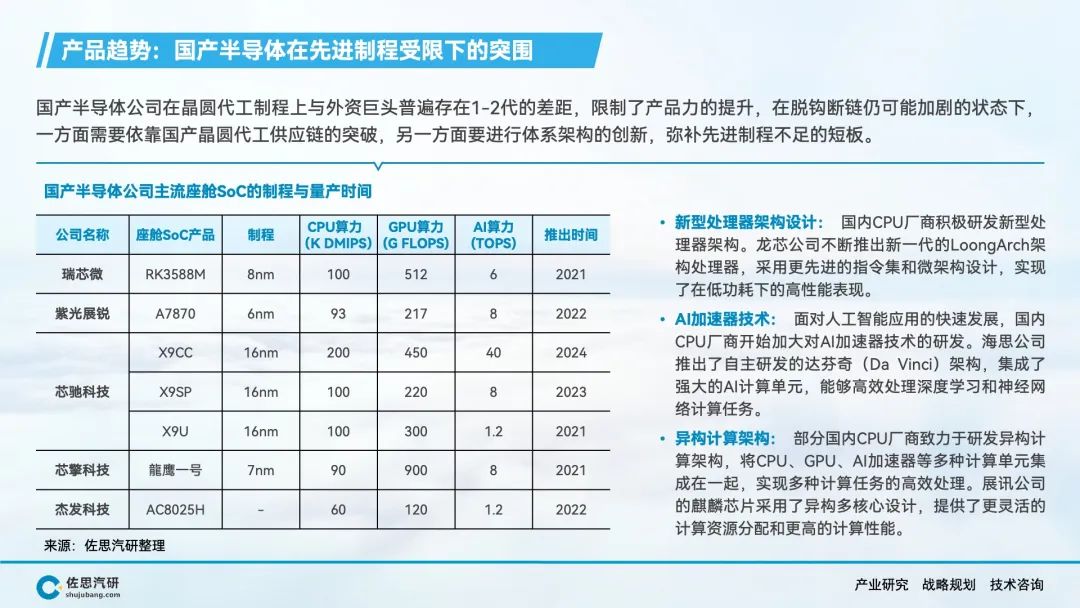 在可预见的未来,中西方脱钩趋势仍将持续,对广大国内企业来说,供应链风险也必须考虑。目前国产车载SoC公司,晶圆制程整体上比竞争对手落后1-2代,如何规避先进制程缺失的短板,需要企业在指令集、异构计算、AI加速技术,软硬件协同层面进行集成创新。假以时日,完全国产化的设备和材料构建的晶圆制造及封装产业链将补上5-7nm工艺制程的短板。