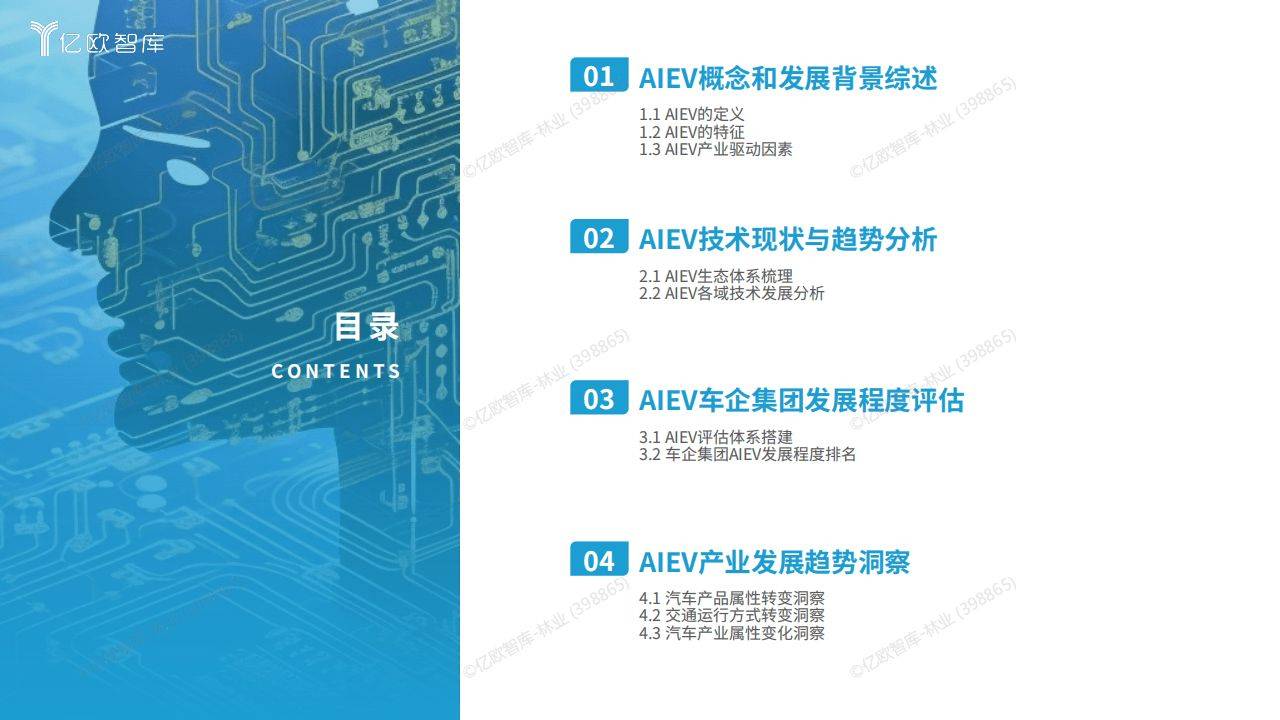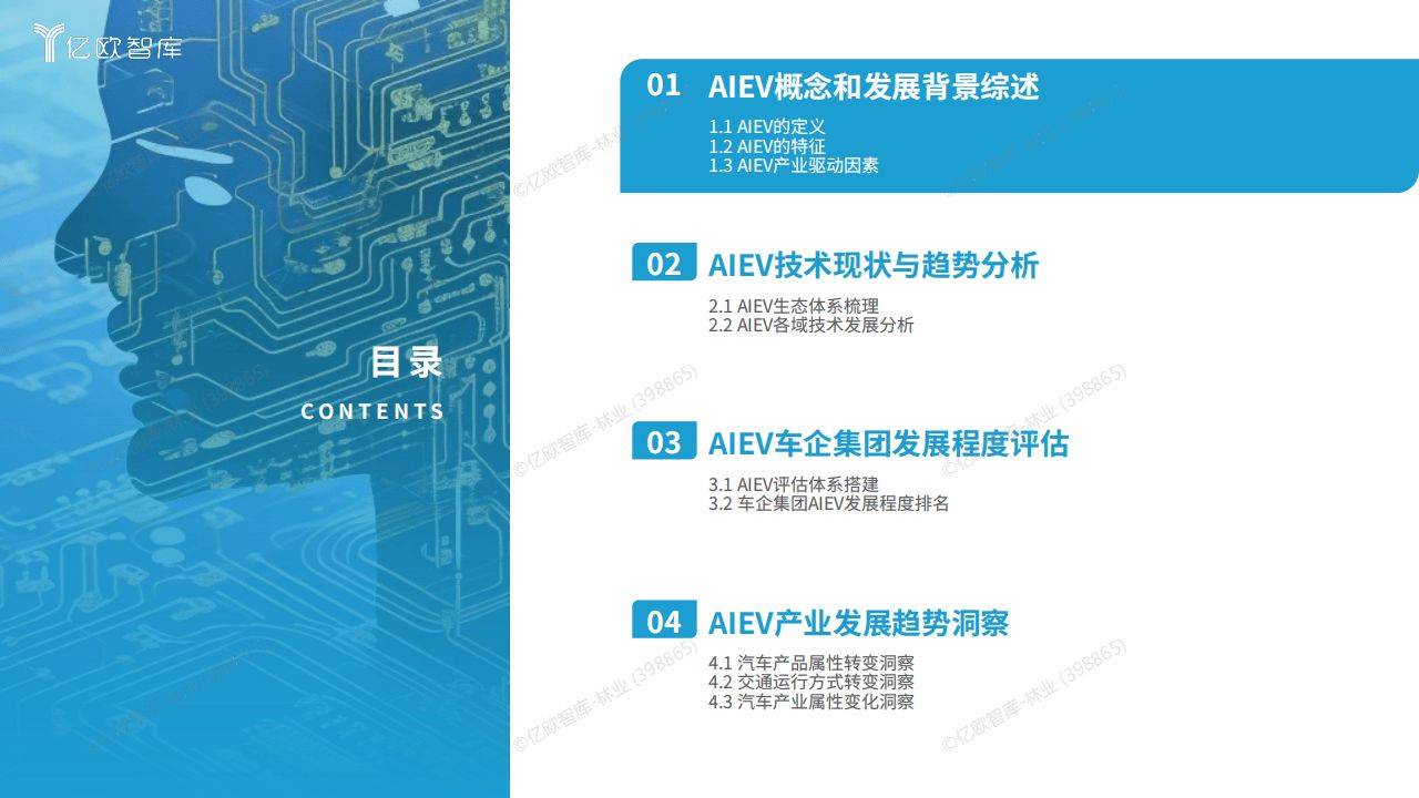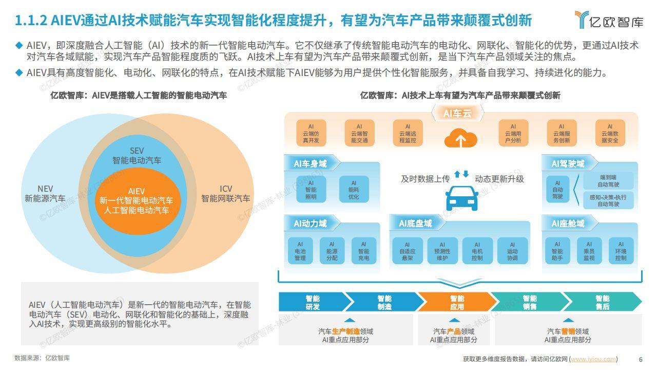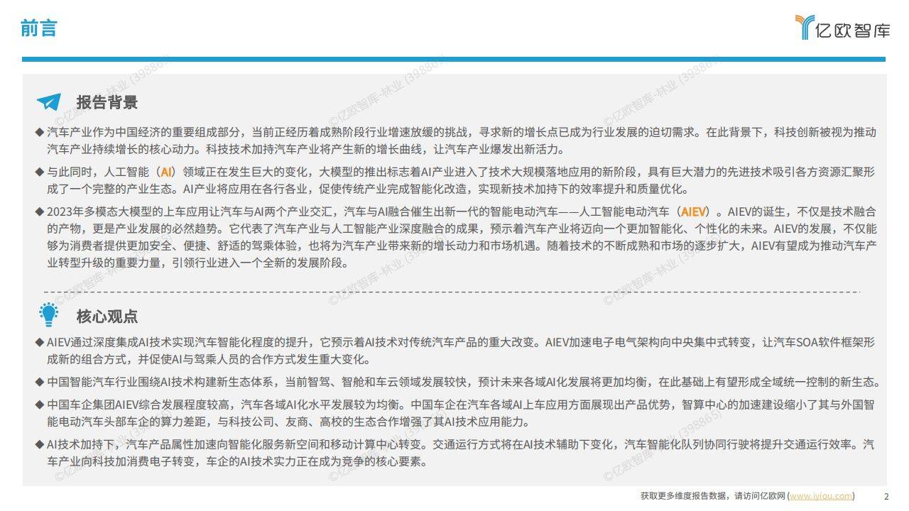 《人工智能开启汽车产业智能化新时代——2024 中国 AIEV 产业研究》由亿欧智库发布,报告深入分析了 AIEV(人工智能电动汽车)的定义、特征、产业驱动因素、技术现状与趋势、车企集团发展程度评估以及产业发展趋势洞察等方面。