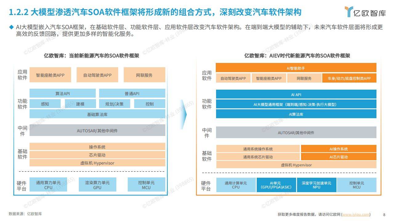 - 中国智能汽车行业围绕 AI 技术构建新生态体系,智驾、智舱和车云领域发展较快。未来各域 AI 化发展将更加均衡,有望形成全域统一控制的新生态。