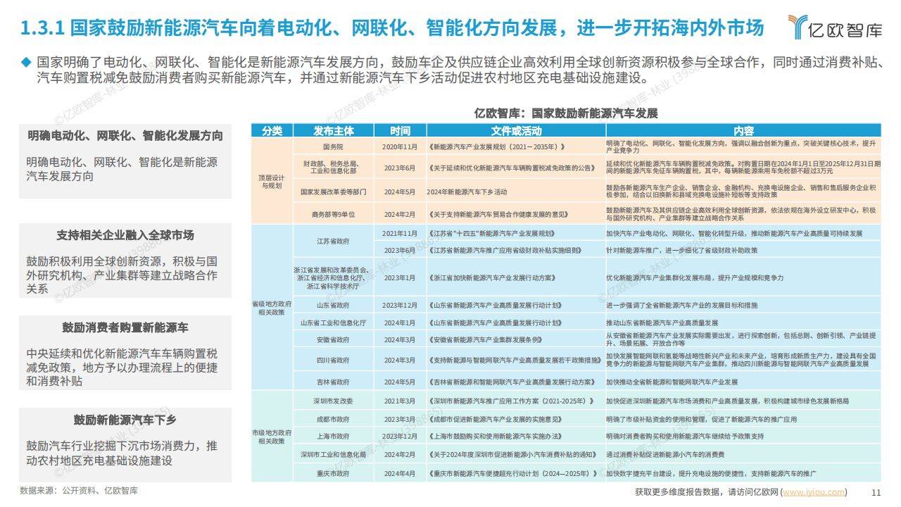 - 国家明确新能源汽车发展方向为电动化、网联化、智能化,鼓励车企及供应链企业参与全球合作,同时通过消费补贴、购置税减免等政策鼓励消费者购买新能源汽车,并推动新能源汽车下乡。