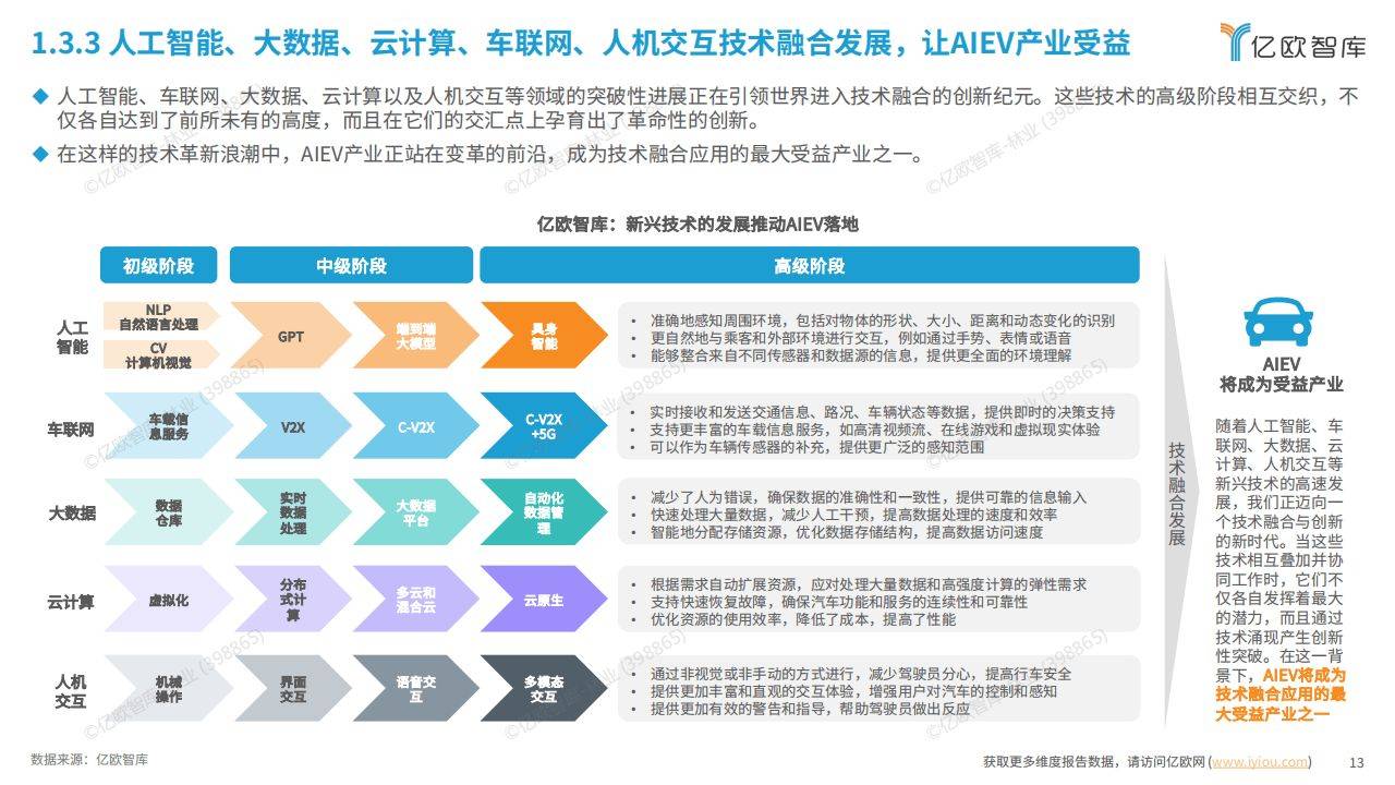 - 人工智能、大数据、云计算、车联网、人机交互等技术融合发展,为 AIEV 产业提供了有力支撑,使其成为技术融合应用的最大受益产业之一。