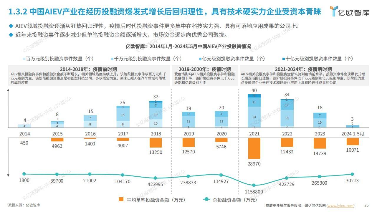 - AIEV 领域投融资经历了从狂热到理性的过程,疫情后投资事件更多集中在具有技术硬实力和可落地应用成果的公司,单笔投融资金额逐渐增大。
