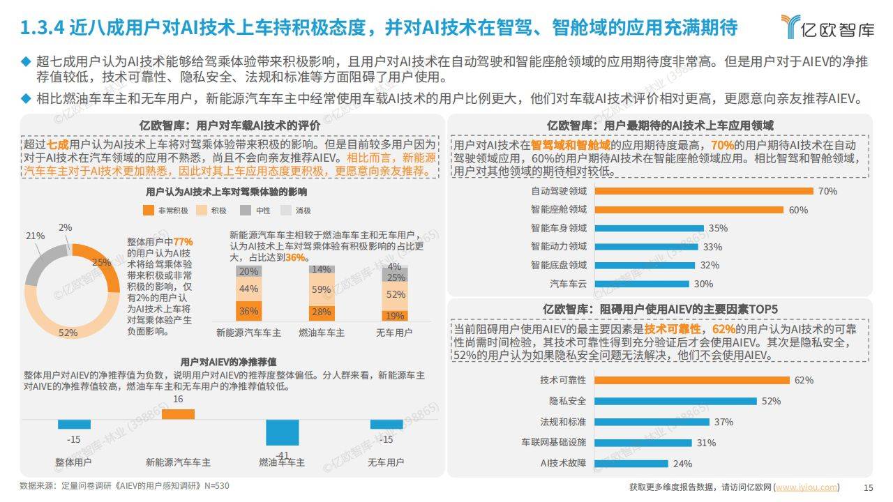 - 99%的用户对 AI 技术在汽车领域的应用有认知,47%的用户使用或体验过搭载 AI 技术的汽车。新能源汽车车主对 AI 技术上车应用更熟悉,且超八成经常使用或尝试过车载 AI 技术。用户对 AI 技术上车应用大多持积极态度,对其在智驾、智舱域的应用充满期待,但对 AIEV 的净推荐值较低,技术可靠性、隐私安全等是主要阻碍因素。