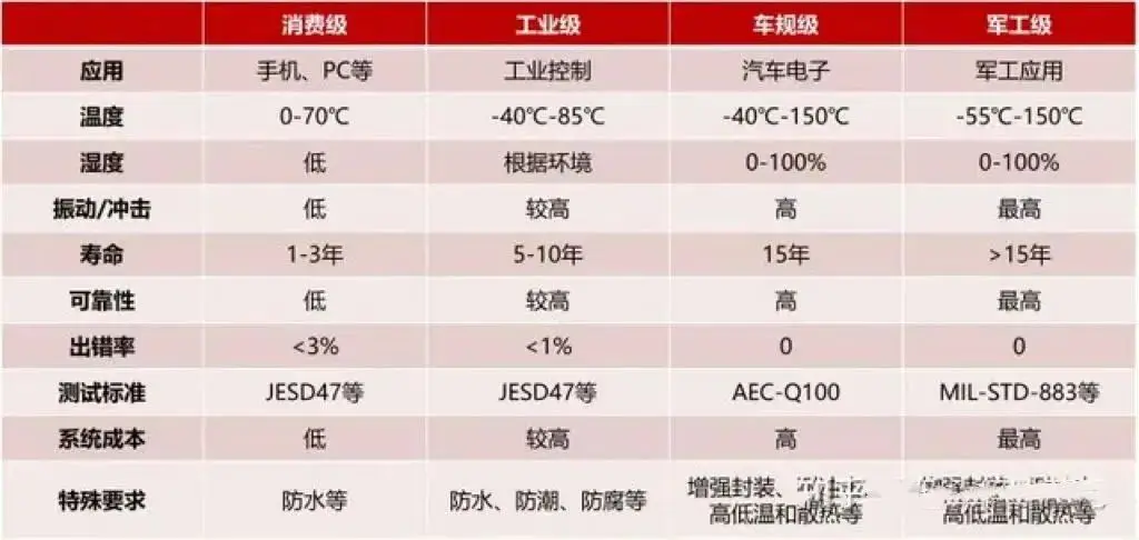 通俗来讲,车规级电子元件按照应用场景,通常可以分为消费级、工业级、车规级和军工级四个等级,其要求依次为军工>车规>工业>消费。