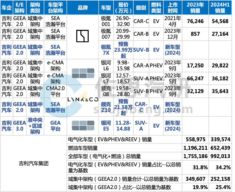 吉利汽车E/E架构部署进展(列举部分车型)