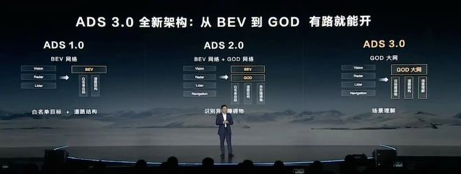 “我们的感知经过了从BEV到GOD,三次迭代,2.0是利用了GOD网络,具有通用障碍物的检测能力,到了3.0的时候我们把BEV和GOD融合成为了更大的GOD网络。”
