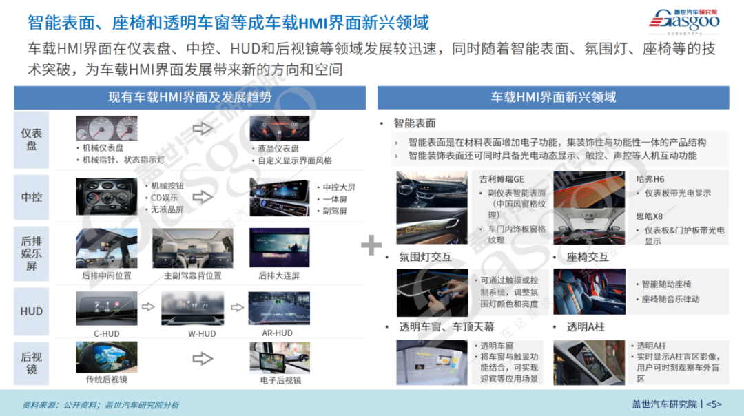 HMI界面:在仪表盘、中控、HUD和后视镜等领域发展较迅速,同时随着智能表面、氛围灯、座椅等的技术突破,为车载HMI界面发展带来新的方向和空间