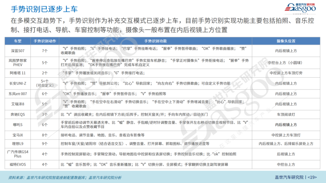 随着面部识别算法的进步,疲劳驾驶提示、主动式DMS疲劳检测、驾驶员生命体征监测、面部识别、情绪识别、声纹识别和手势识别等功能开始陆续上车,目前手势识别实现功能主要包括拍照、音乐控制、接打电话、导航、车窗控制等功能,摄像头一般布置在内后视镜上方位置。