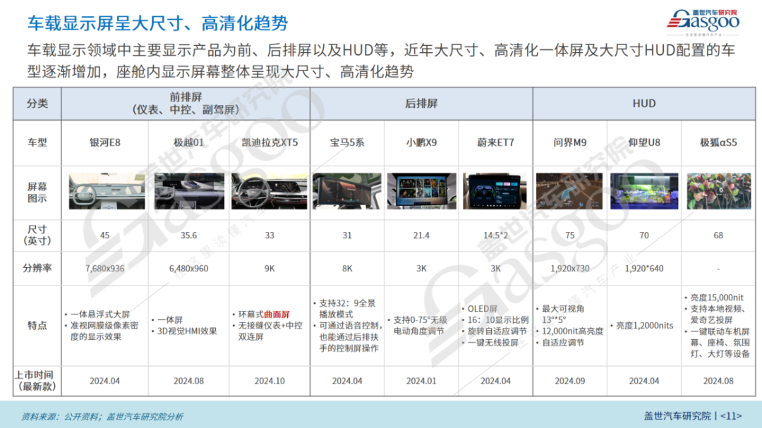 车载显示领域中主要显示产品为前、后排屏以及HUD等,近年大尺寸、高清化一体屏及大尺寸HUD配置的车型逐渐增加,座舱内显示屏幕整体呈现大尺寸、高清化趋势。在后排娱乐屏领域,功能上实现与中控、仪表、副驾屏等的多屏联动,实现无线投屏、内容共享、控车等功能,部分车企或供应商推出后排吸附pad方案及可滑动、可卷曲后排娱乐屏,利于节省后排空间。