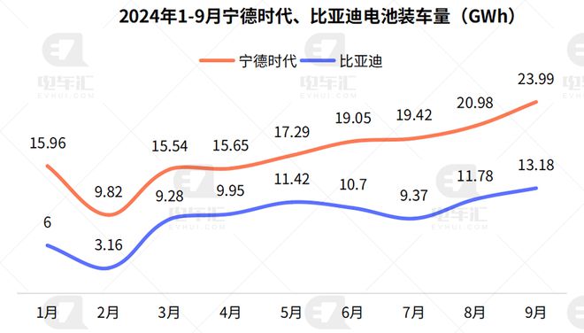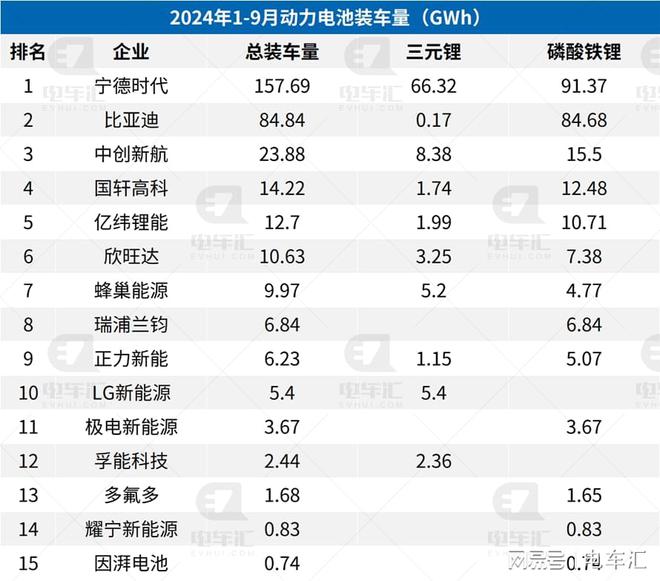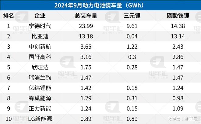 具体企业方面,9月份总装车量最高的企业是宁德时代,达到了23.99GWh;其次是比亚迪,为13.18GWh;中创新航、国轩高科和欣旺达分列三到五位,装车量分别为3.65GWh、3.16GWh和1.75GWh。