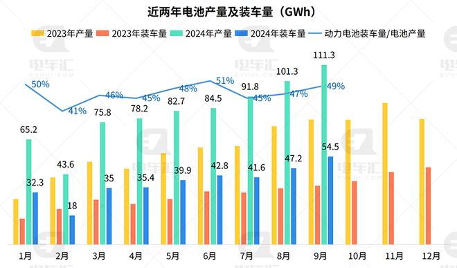1-9月电池累计产量734.4GWh,动力电池累计装车量346.6GWh,累计装车量占累计产量的47%。