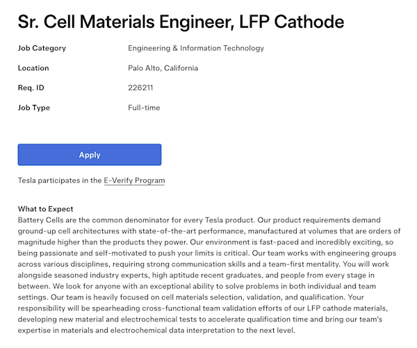 该职位名为“LFP阴极高级电池材料工程师”,工作地点位于特斯拉位于加利福尼亚州帕洛阿尔托的人工智能和工程总部。