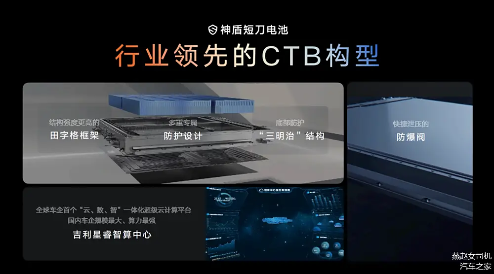 细究这一系列安全试验成绩的背后,除了神盾短刀电池独特的结构设计,以及柔韧度更强的双涂层隔膜、氧化铝等耐热涂层材质的加持外,还与行业领先的CTB电池包构型有关,围绕电池包框架设计、底部防护、架构防护、意外热失控、电芯多重防护、智能安全等方面进行升级迭代。