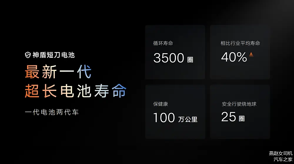 同时还是由于神盾短刀电池长度更短,内阻更小,电芯发热量更低,内部化学反应速度有效减缓,加之正负极材料优化,可延长电池寿命。据官方数据表示,神盾短刀电池拥有3500圈循环寿命,可安全行驶超100万公里,按照一般家庭一年2万公里左右的使用频率来算,这一块电池能让你用上好几十年,妥妥的“两代车”神器!而得益于电池衰减有效减缓,还大大提升了二手车的保值率。