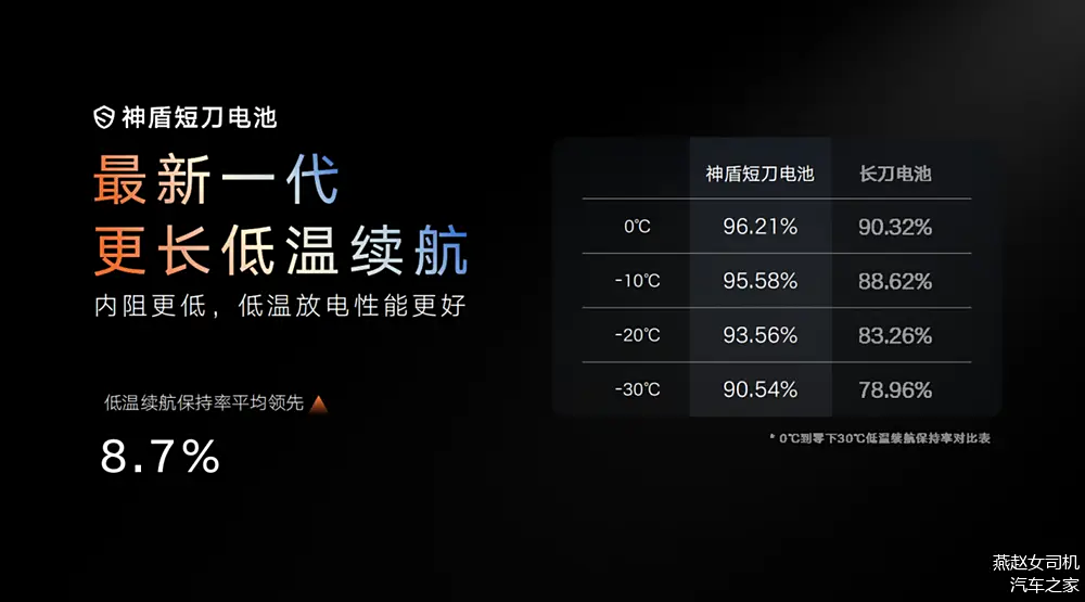 不仅充电更快,神盾短刀电池在低温环境下还拥有更长的续航里程。由于厚度为18.2mm,比长刀电池更厚,所以在低温放电时热量散失更慢,并且神盾短刀电池正负极间的电荷传导更快、放电性能更佳,加之低阻抗成膜添加剂可降低电池低温放电时的内阻,在0℃、-10℃、-20℃、-30℃的温度测试下,神盾短刀电池的低温放电容量保持率均高于长刀电池,平均领先8.7%,彻底打破了“磷酸铁锂电池怕冷”的刻板印象。