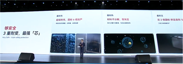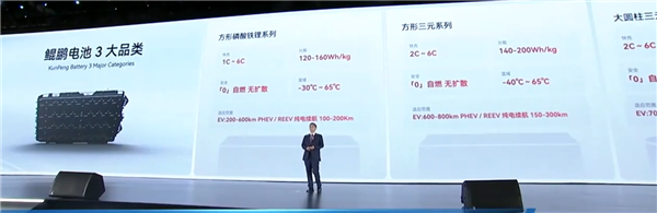 鲲鹏电池支持最大6C快充,电芯循环寿命超3000次,首次采用多截面吸能设计技术,支持1s快速定向泄压。