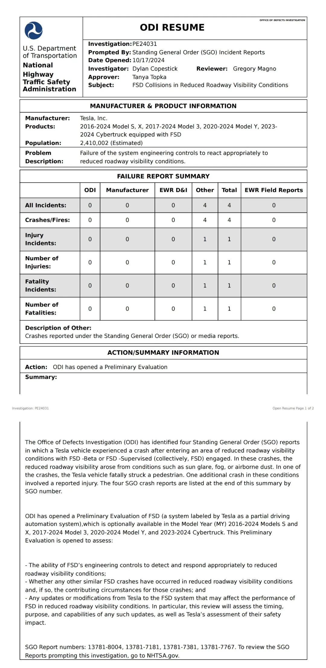 而做出本次调查决定的原因,是一辆激活FSD的特斯拉车辆撞死了一名行人;此外,还涉及到多起事故。按照NHTSA的评估,此次调查将涉及美国市场已经销售交付的约240万辆特斯拉5款型号车辆,包括Model S、Model X、Model 3、Model Y以及Cybertruck。
