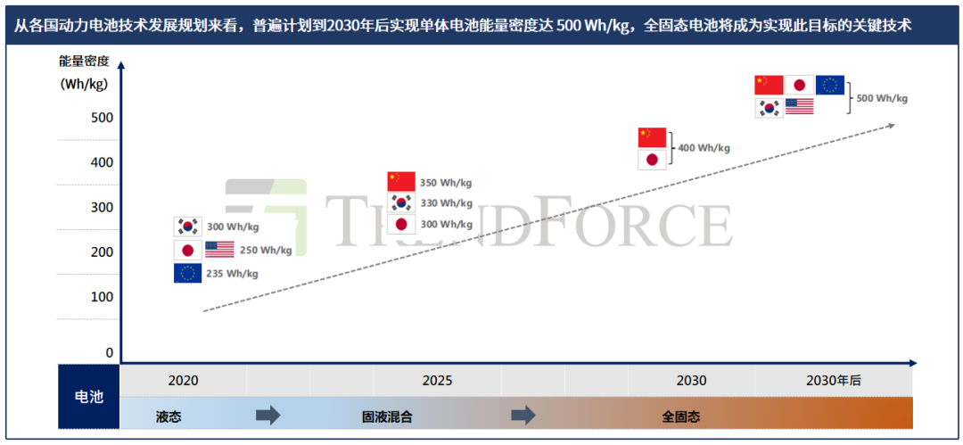 固态电池作为有望提高电池本征安全性和能量密度的下一代技术,已被美国、欧盟、中国及日韩主要国家列入国家发展战略范畴,并将成为支撑各国二次电池能量密度到2030年后突破500Wh/kg目标的关键技术。