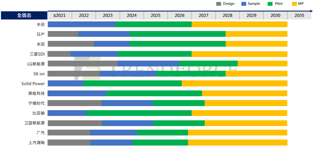 但前十年的基础研究和原型电芯开发的实现,产业已完成对固态电池技术可行性的探索和判断,本十年内将成为固态电池产品商业落地的关键期。此阶段在产业资本和社会资本的助推下,产业链上下游企业以及产、学、研之间的协同合作变得活跃,多数成熟的电池制造商和初创企业都制定了固态电池商业化路线图。目前丰田、日产、三星SDI等全球领先制造商的全固态电池已进入试制阶段,TrendForce集邦咨询预计,随着全球各厂商量产竞速,全固态电池有望在2027年前达到GWh级量产。
