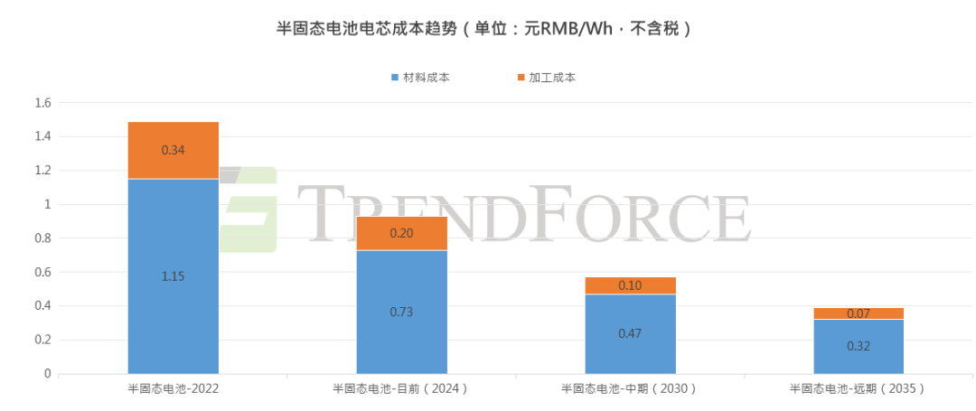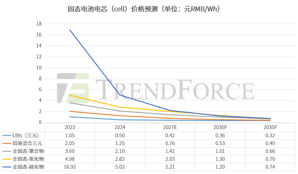 目前半固态电池在电动汽车领域已实现GWh级小规模应用,电芯能量密度300-360 Wh/kg,但电芯价格仍高于1元RMB/Wh。全固态电池正处于从样件电芯向工程化转化的阶段,量产初期(2027-2028年)预计成本较高,电芯价格将落在1-3元RMB/Wh,EV市场应用规模≤1GWh。2030年后当全固态电池形成一定规模时(≥10GWh),预计电芯价格将降至1元RMB/Wh左右,到2035年经过市场大规模的快速推广后,TrendForce集邦咨询预计全固态电芯价格有望降至0.6-0.7元RMB/Wh。