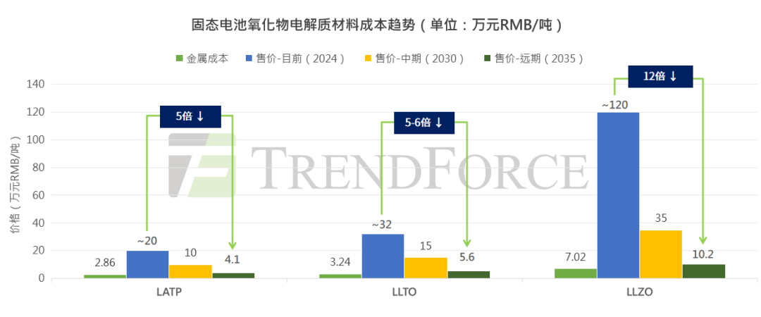 成本方面,相比之下其综合成本介于聚合物和硫化物基固态电池之间,但氧化物固态电解质也存在加工难度大等缺点,尤其是超薄型氧化物固态电解质隔膜(<30μm),因此其隔膜厚度通常较厚,不利于电池能量密度的提升和单位瓦时成本的降低。其次,目前常用的几种氧化物电解质,如LLTO、LATP、LLZO等,虽然已有部分企业具备千吨级量产能力,但市场应用层面该材料还未规模化放量,材料实际售价接近其金属总成本的10倍左右,未来还有较大降本空间。