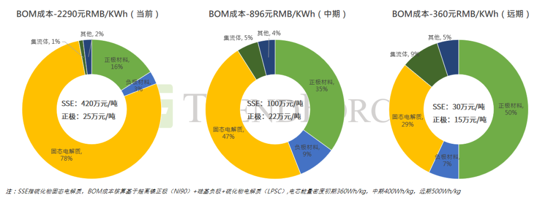 但硫化物电解质面临材料成本偏高等劣势,目前硫化物固态电解质及其前驱体硫化锂材料尚未实现工业化批量制备,且硫化物电解质空气稳定性差、对水分非常敏感,因此对电池制造的环境要求较高,最终导致硫化物基固态电池成本高,预估硫化物基固态电池产业化初期电芯BOM成本在1-2元RMB/Wh,当硫化物电解质规模量产后,中期(2030年)电芯BOM成本预计在1元RMB/Wh以内,远期(2035年)当固态电解质成本降至30万元RMB/吨以内时,电芯BOM成本有望降至0.4元RMB/Wh以下。