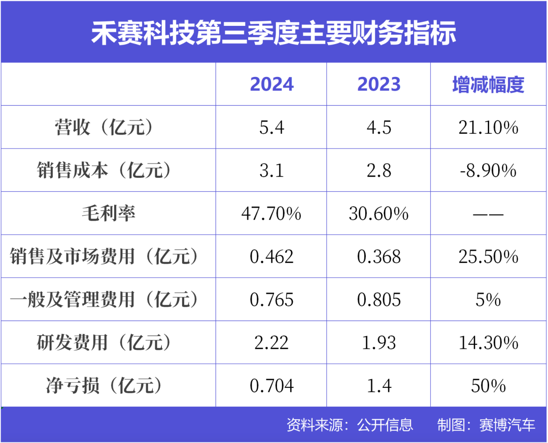 所以禾赛第三季度的毛利率进一步增长至47.7%,较去年同期的30.6%增加了17.1个百分点。同时这也是禾赛科技自2022年第二季度以来的毛利率水平最高点。支出方面,禾赛反映出来的一个状态是,核心任务诸如市场拓展以及研发工作给予重点投入,自身日常经营则是勒紧裤腰带尽力降本增效。反映在数据上,第三季度禾赛销售及市场支出为4620万元,较去年同期增长25.5%;研发投入2.22亿元,较去年同期增加14.3%。