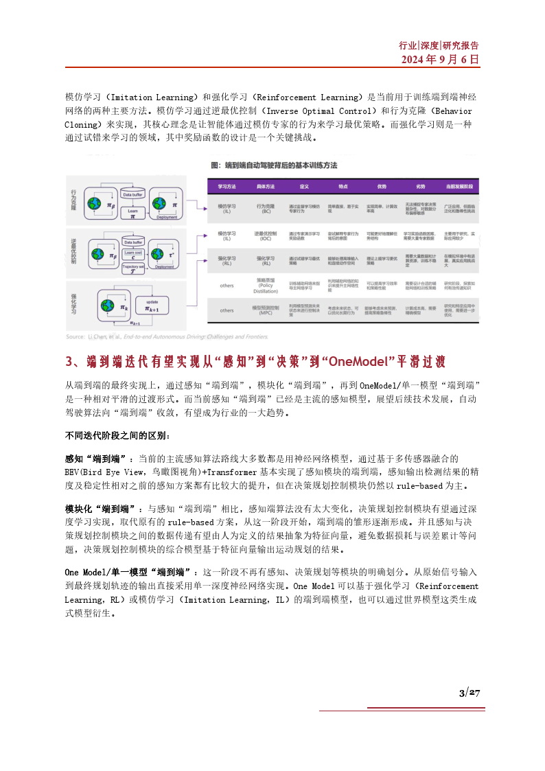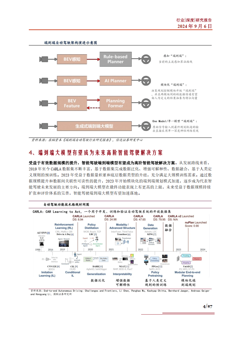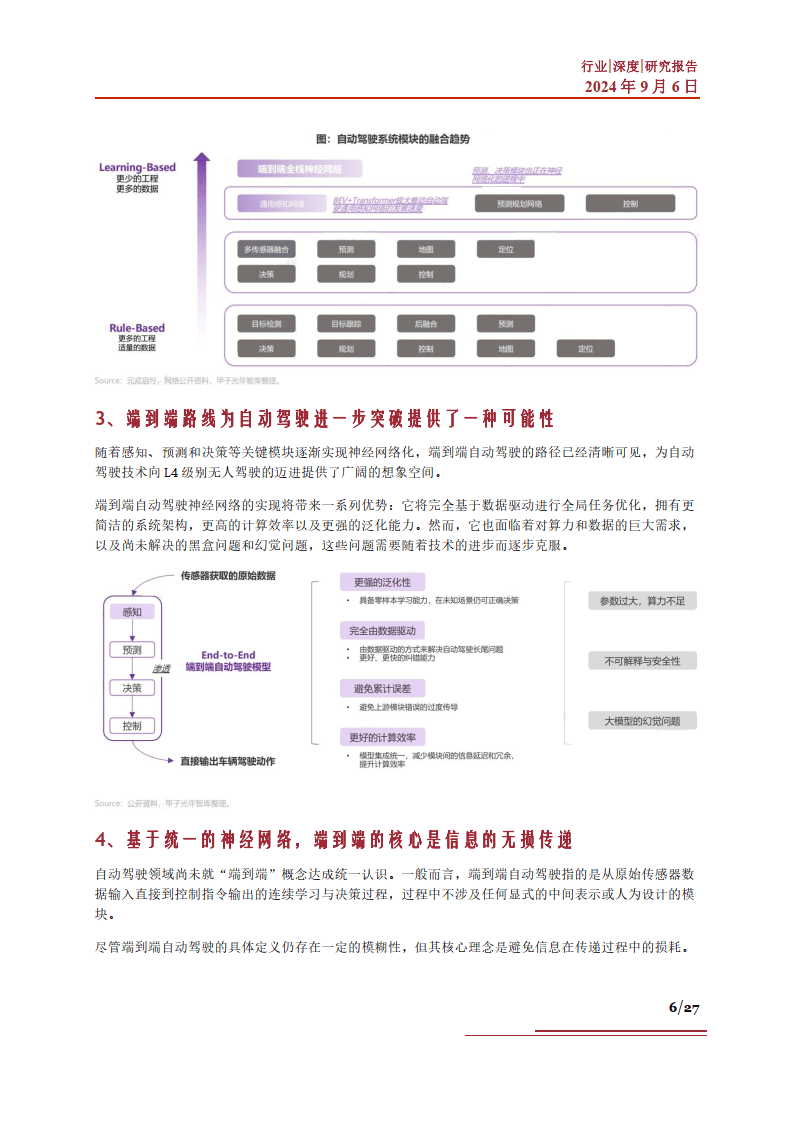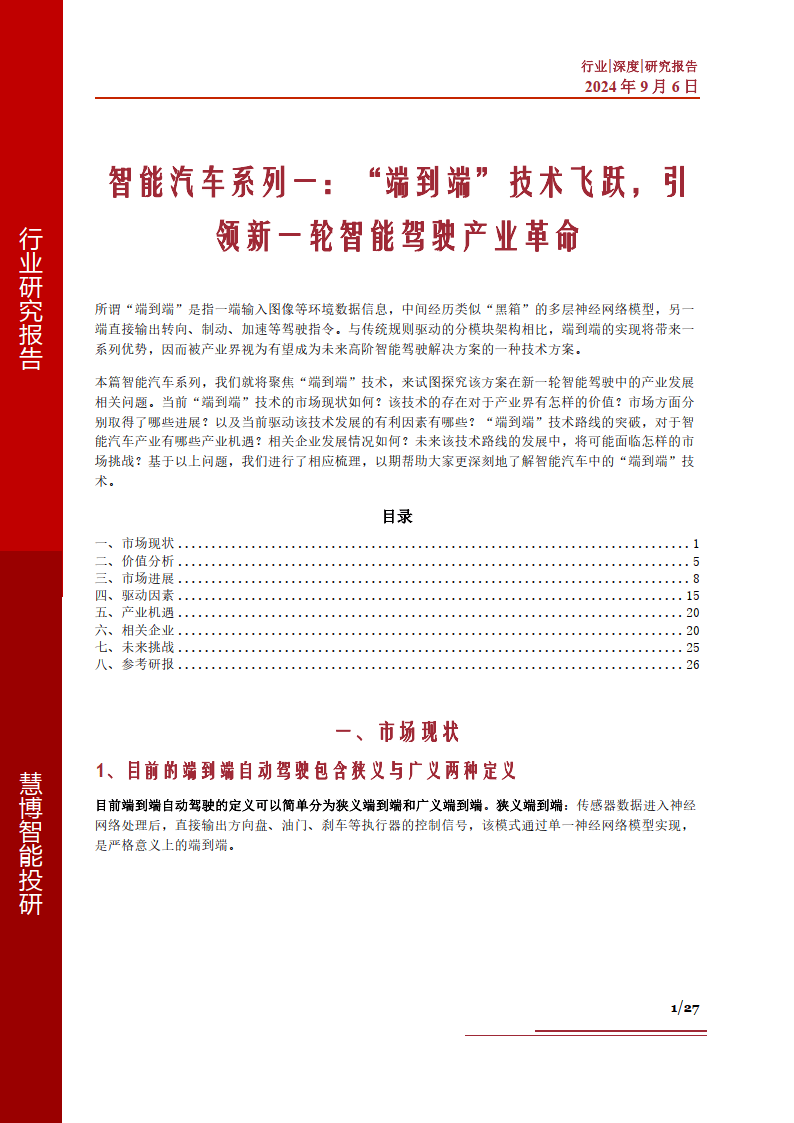 本篇智能汽车系列,我们就将聚焦“端到端”技术,来试图探究该方案在新一轮智能驾驶中的产业发展 相关问题。当前“端到端”技术的市场现状如何?该技术的存在对于产业界有怎样的价值?市场方面分 别取得了哪些进展?以及当前驱动该技术发展的有利因素有哪些?“端到端”技术路线的突破,对于智 能汽车产业有哪些产业机遇?相关企业发展情况如何?未来该技术路线的发展中,将可能面临怎样的市 场挑战?基于以上问题,我们进行了相应梳理,以期帮助大家更深刻地了解智能汽车中的“端到端”技 术。