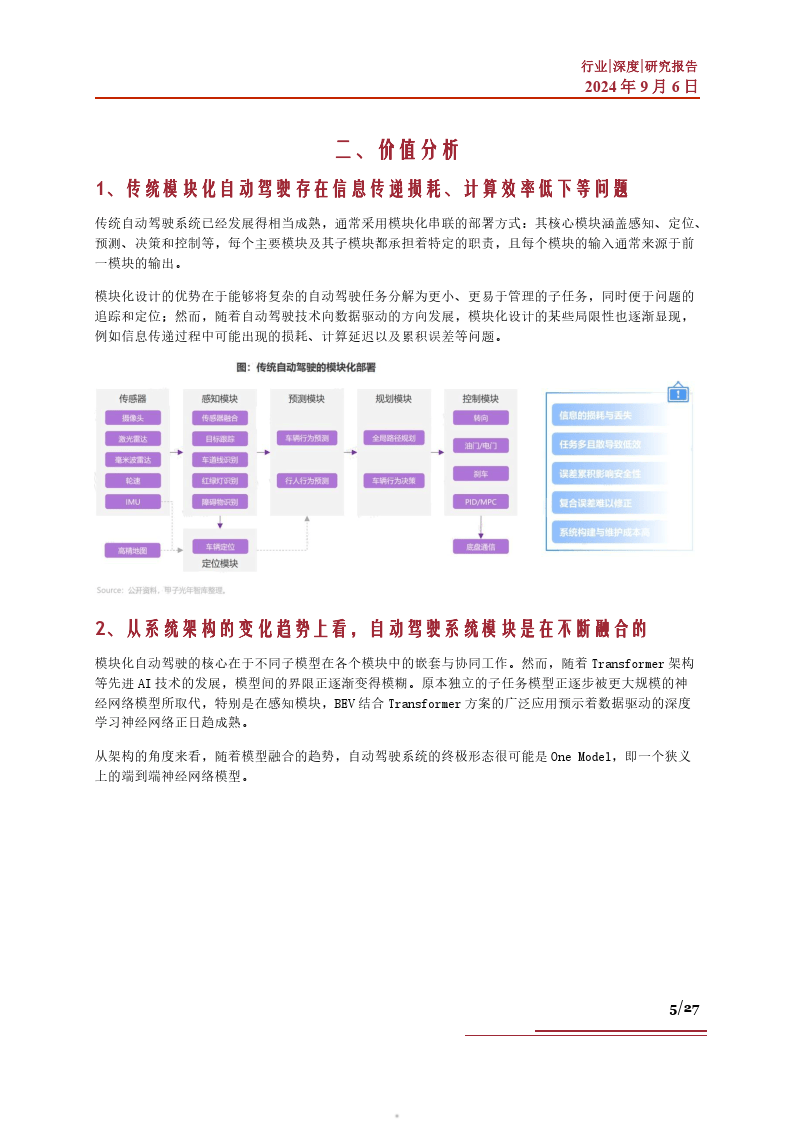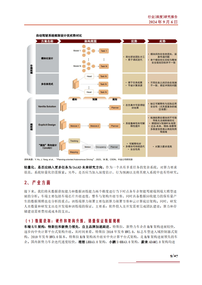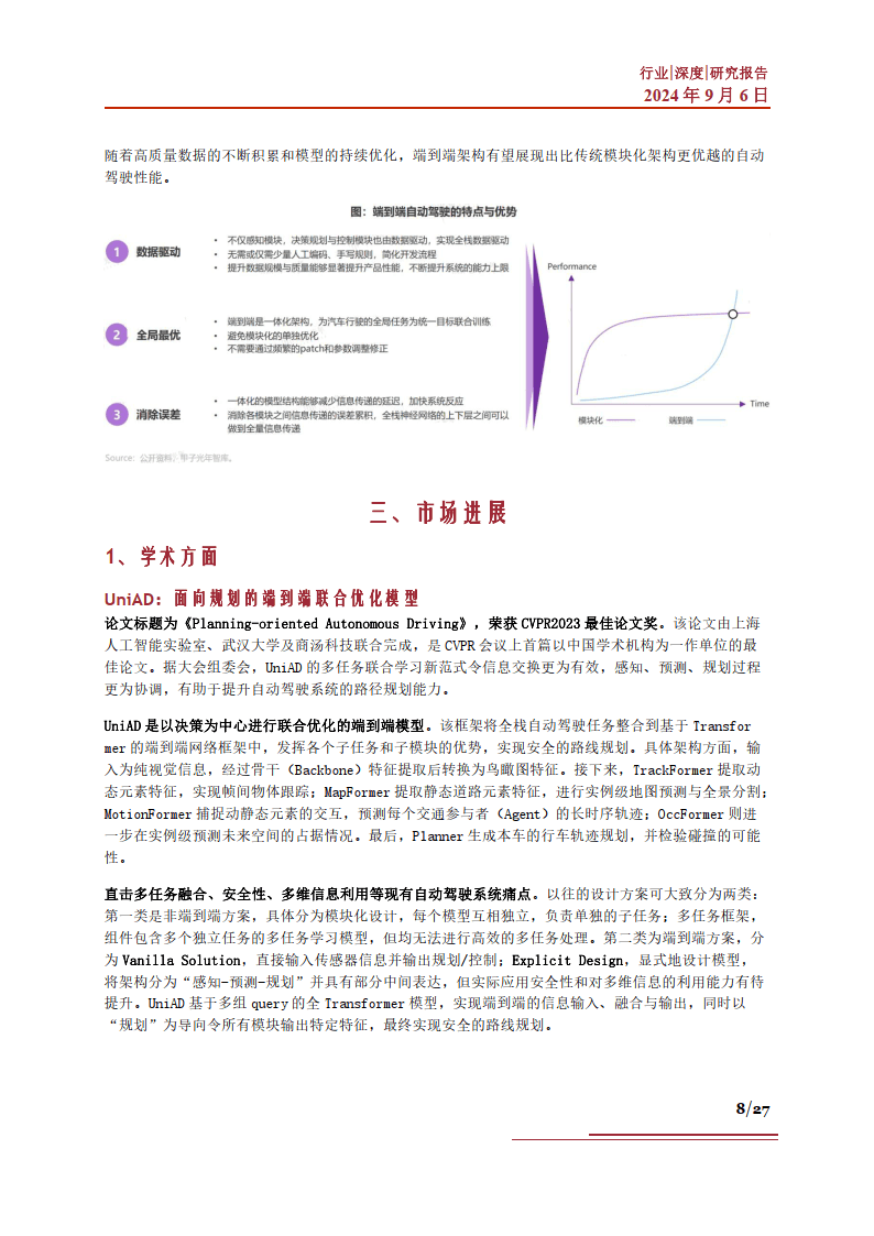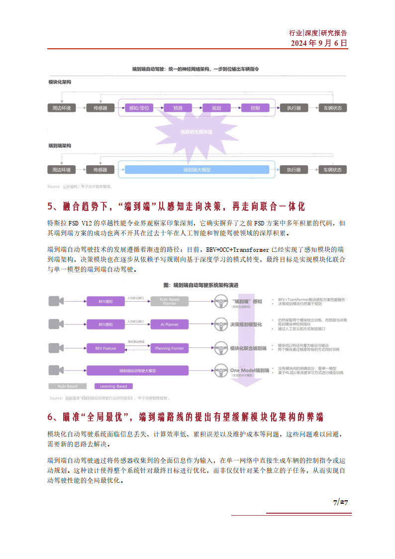 本篇智能汽车系列,我们就将聚焦“端到端”技术,来试图探究该方案在新一轮智能驾驶中的产业发展 相关问题。当前“端到端”技术的市场现状如何?该技术的存在对于产业界有怎样的价值?市场方面分 别取得了哪些进展?以及当前驱动该技术发展的有利因素有哪些?“端到端”技术路线的突破,对于智 能汽车产业有哪些产业机遇?相关企业发展情况如何?未来该技术路线的发展中,将可能面临怎样的市 场挑战?基于以上问题,我们进行了相应梳理,以期帮助大家更深刻地了解智能汽车中的“端到端”技 术。