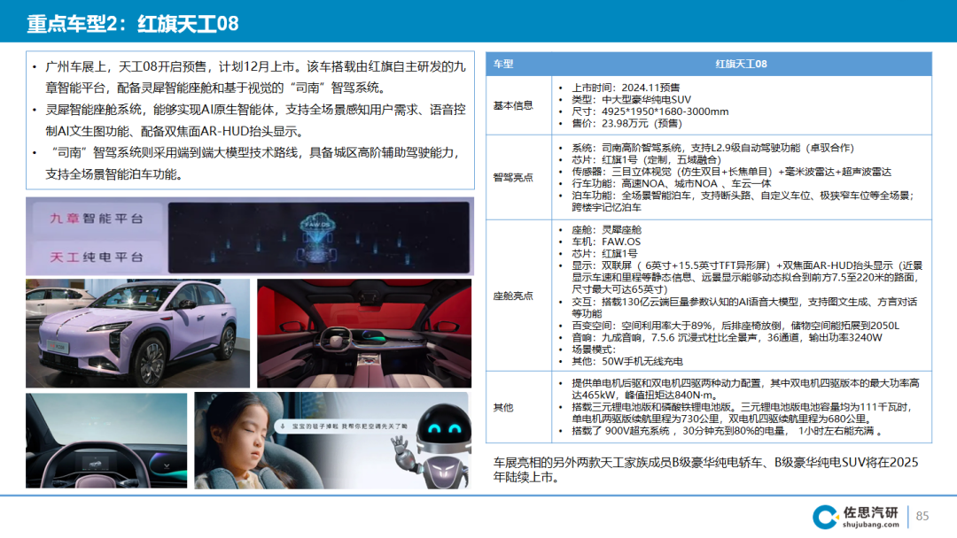 11月15日,红旗天工08开启预定,预订价23.98万元起。该车是红旗自主研发的九章智能平台首款车型,计划12月底正式上市。