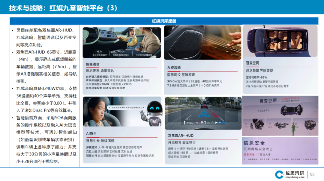 红旗九章智能平台于车展前夕(11月12日)发布,以全栈自研的飞刃架构为中枢,集成了整车级操作系统FAW.OS,以及首颗车规级5nm制程五域融合芯片“红旗1号”等。通过车云协同的AI算法持续训练迭代,为用户提供红旗灵犀座舱和红旗司南智驾。