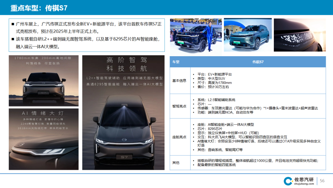 11月15日,广汽传祺正式发布全新EV+新能源平台,该平台首款车——传祺S7首发亮相,预计在2025年上半年正式上市。