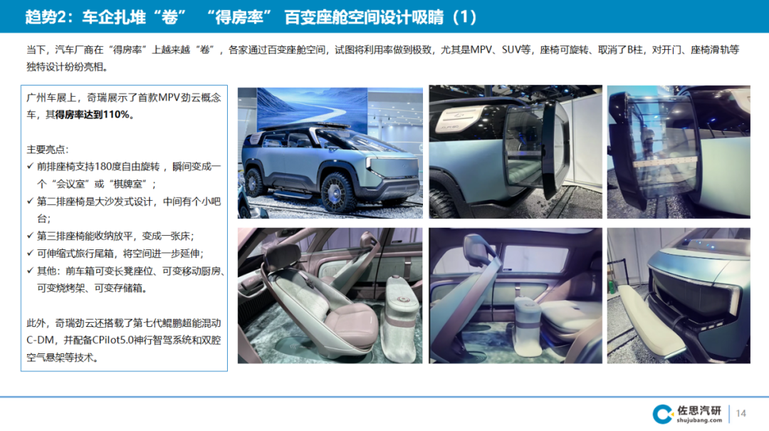 本届车展,奇瑞展示了首款MPV劲云概念车,得房率甚至高达110%。该车定位新能源休旅MPV,采用无B柱对开门设计,配备三排座椅,前排支持180度自由旋转座椅,可直接与二排对坐,变成移动客厅;二、三排座椅可折叠放平,并且下沉式后备厢可将第三排座椅收纳。