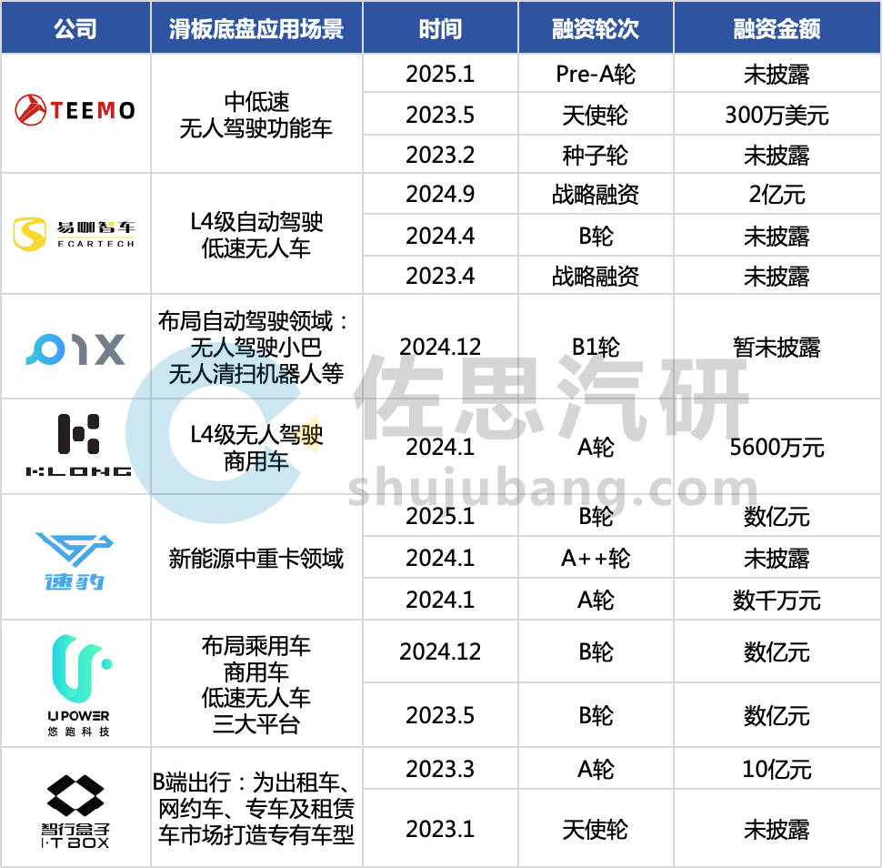 布局于低速无人车的滑板底盘技术方案商:尚元智行、易咖智车,均在2023~2025年完成了3轮融资,PIX Moving在2024年12月完成了B1轮融资;