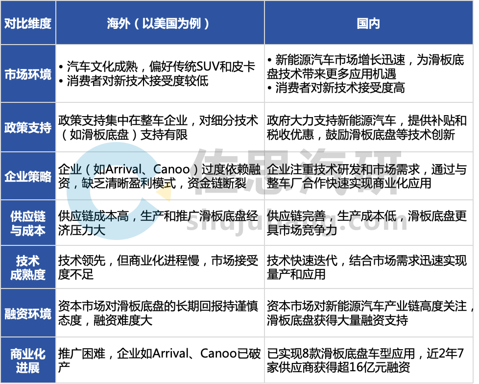 滑板底盘在海外推广受阻,国内却蓬勃发展,究其原因是海外滑板底盘推广受限于新能源汽车市场渗透率较低、政策支持不足、供应链成本高,而国内则凭借政策支持、成熟的供应链、资本青睐和技术快速迭代导致的。以下是滑板底盘在海外推广困难而在国内快速发展的对比分析表格: