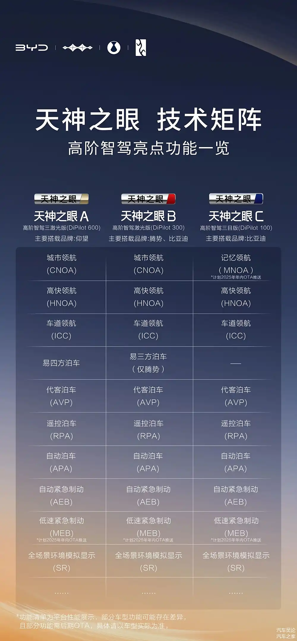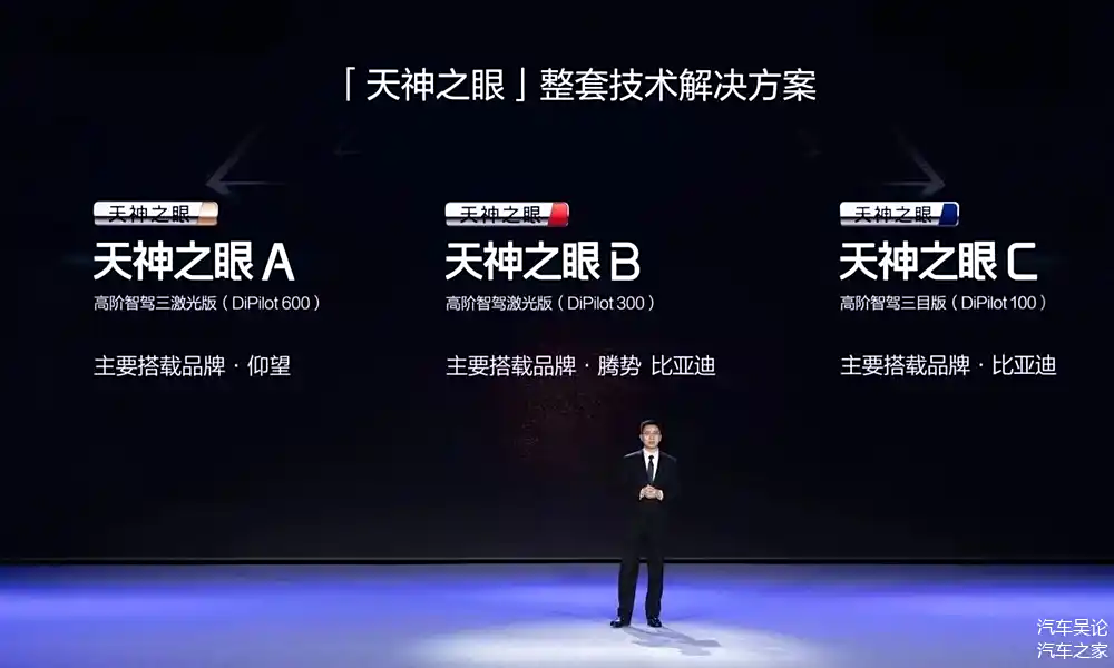 官方公布的天神之眼技术矩阵图比较详细,这里我来简单叙述一下:天神之眼A是三激光版,堪称智驾界的“尖子生”,搭载于仰望品牌,在3颗激光雷达和双Orin X芯片的加持,易四方泊车能力出众,城区、高速、泊车各个环节都能领航,可让你全场景无忧;天神之眼B是激光版,高阶智驾能力和行业头部水平齐平,将用于腾势及比亚迪中高端车型,在激光雷达和OrinX芯片的助力下,城市、高快领航不在话下,部分车还有易三方泊车本领;天神之眼C三目版则面向大众,覆盖7万到20万级主流车,用独特方案支持高速领航、代客泊车等功能,实惠又实用。