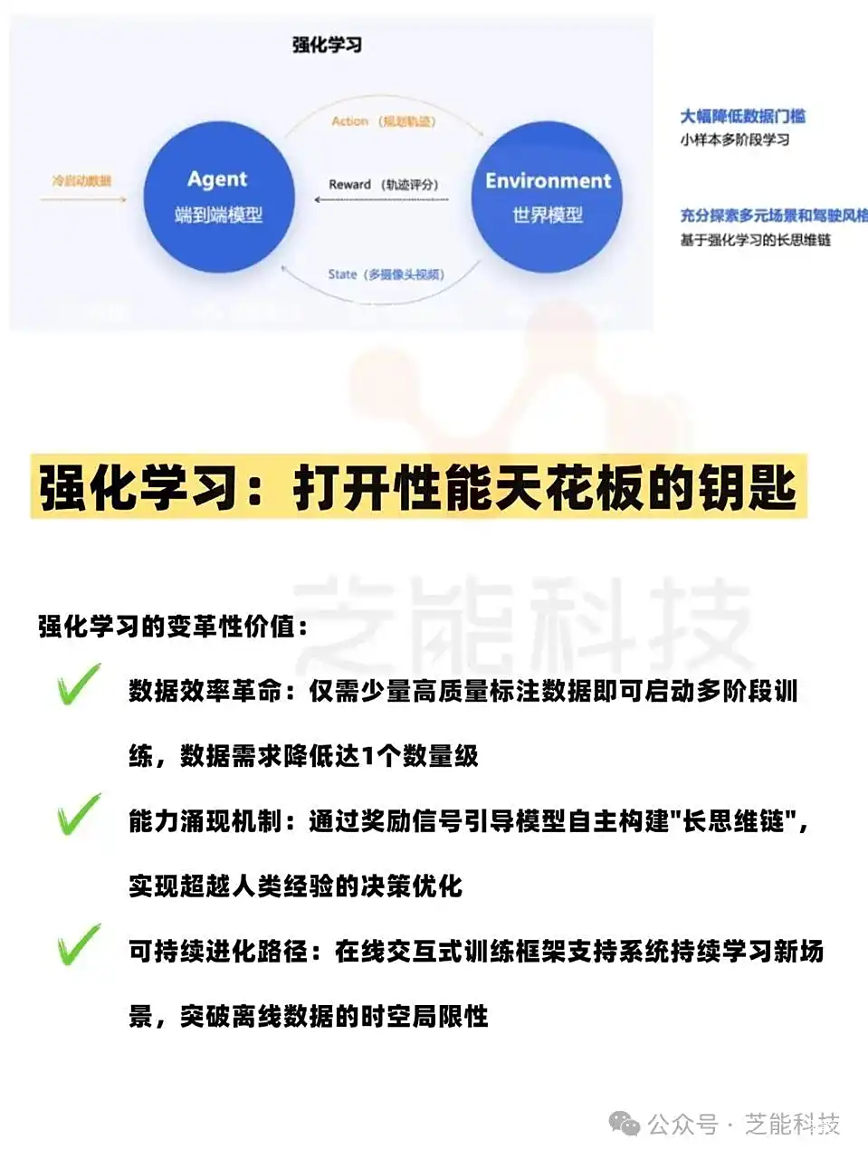 DeepSeek-R1在春节期间的技术突破印证了强化学习的变革性价值,少量高质量标注数据即可启动多阶段训练,数据需求降低达1个数量级;通过奖励信号引导模型自主构建'长思维链',实现超越人类经验的决策优化;在线交互式训练框架支持系统持续学习新场景,突破离线数据的时空局限性。