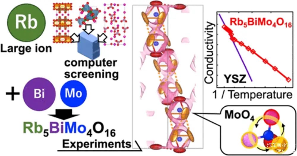 鉴于先前的研究表明,一些含铋(Bi)的材料和含钼(Mo)的氧化物具有较高的氧化物离子导电性,该团队选择了Rb5BiMo4O16作为有前景的候选材料。