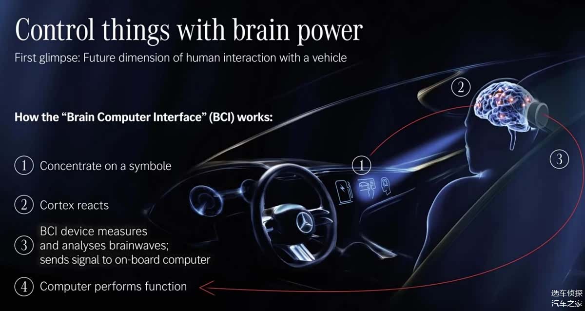 这一切不再是科幻,一汽申请了一项名为 “基于生物—物理耦合的车辆控制方法”的技术专利,这项专利描绘了一幅图景:驾驶员只需戴上轻盈的非侵入式设备,类似智能头带或耳机,车辆便能精准捕捉其意图,除了一汽,奔驰也在此前发布过类似技术的概念车。