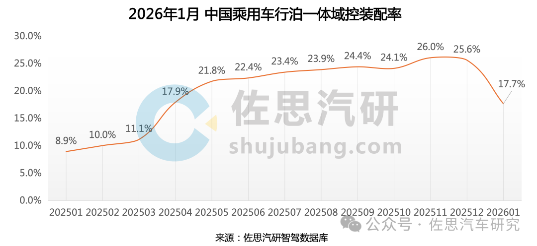 2026年1月,中国乘用车行泊一体域控装配量达26.7万辆,同比增长67.6%,占整体智驾域控装配量的61.6%。行泊一体装配率达17.7%,较上年同期增长8.7个百分点。