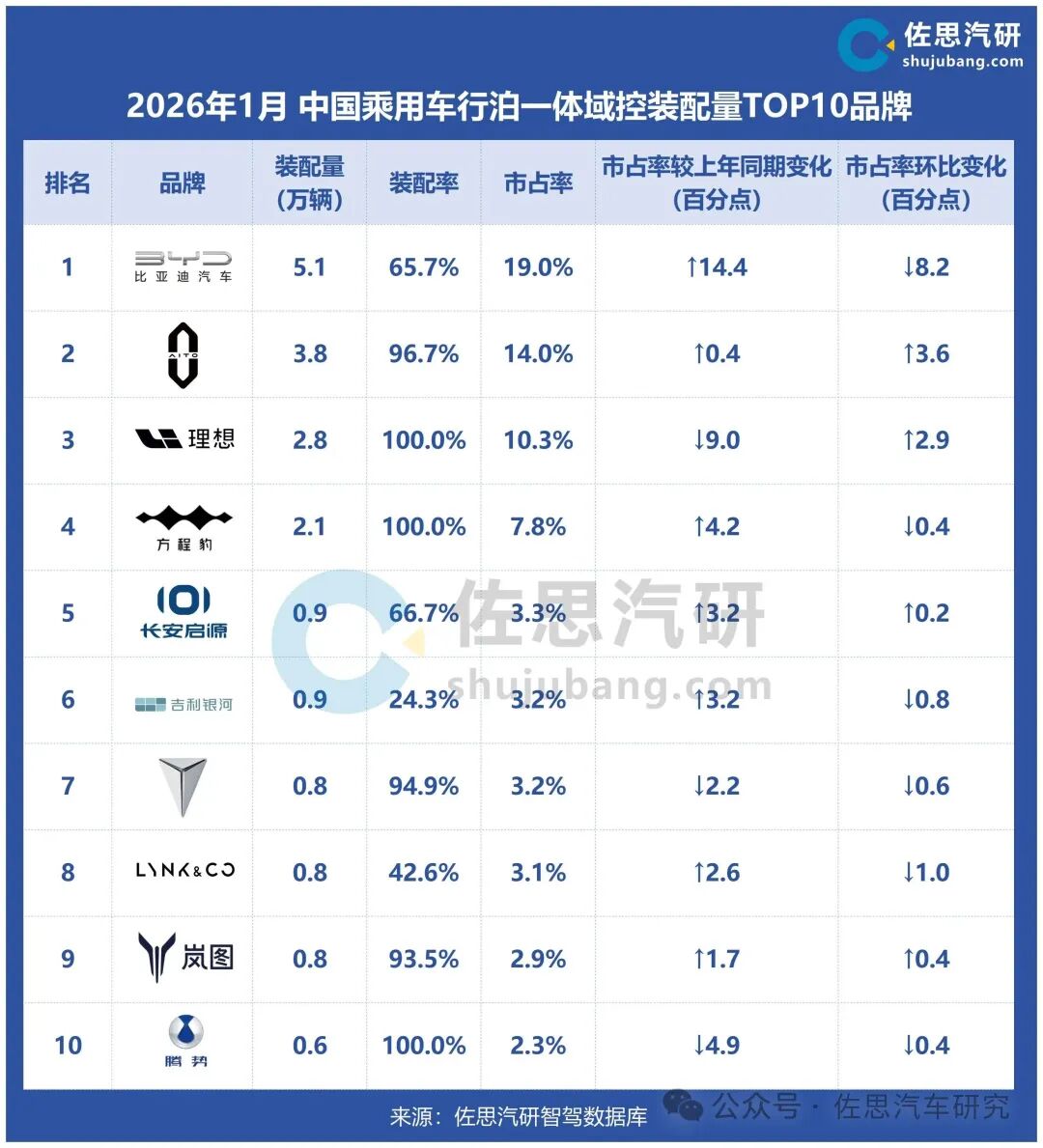 就TOP10搭载品牌看,比亚迪(装配量5.1万)、问界(装配量3.8万)、理想汽车(装配量2.8万)位居前三,三者合计装配量达11.6万辆,占TOP10总量的64.6%。
